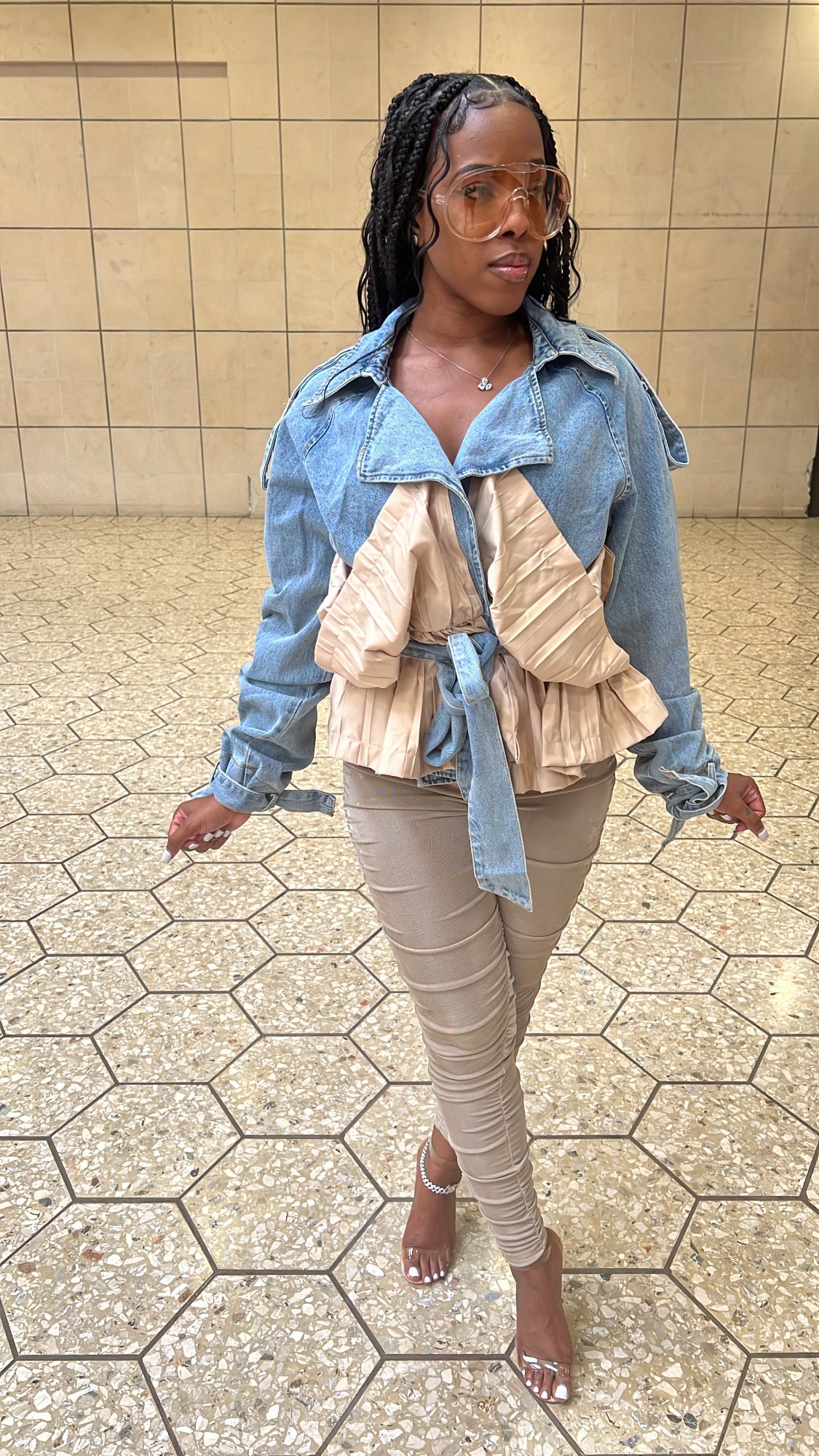 Turn everyday denim into a runway moment with the Denim Drama Pleated Jacket. Featuring a bold beige pleated contrast panel and a cinched waist with a matching denim belt, this piece is where rugged meets refined. The oversized fit and voluminous pleats add movement and flair, while the structured design keeps it sleek and modern.